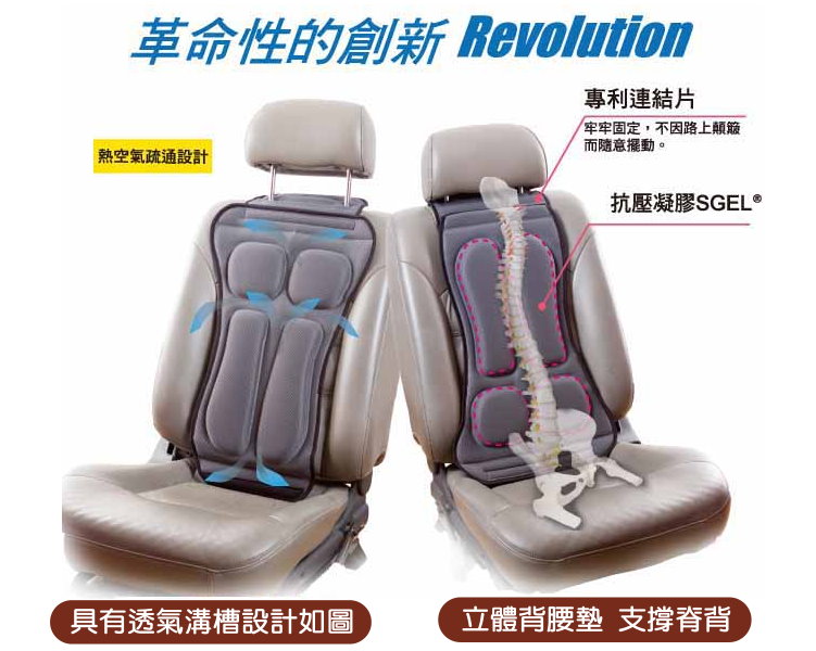 內有醫療等級凝膠,吸震舒壓 立體式的人體工學設計 從腰至背都支撐得到 彈性舒適支撐 隨盒附專利連結帶,穩妥安裝原車
